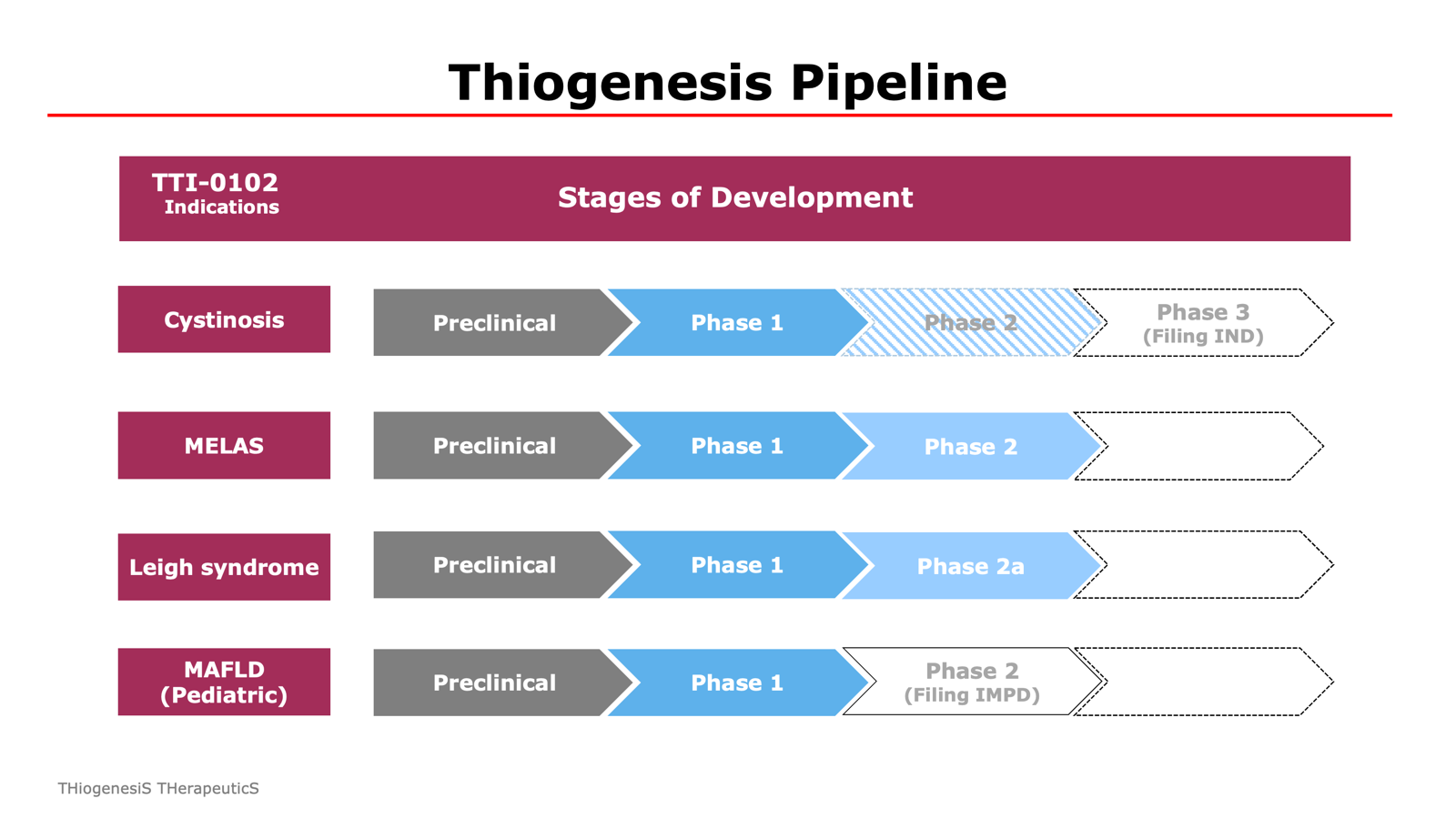 There are an estimated 2,000–2,500 patients with nephropathic cystinosis worldwide. Thiogenesis plans to file an IND in early 2026 for a pivotal Phase 3 non-inferiority trial comparing TTI-0102 to existing cysteamine therapies. If successful, TTI-0102 may offer a meaningful improvement in quality of life for patients.